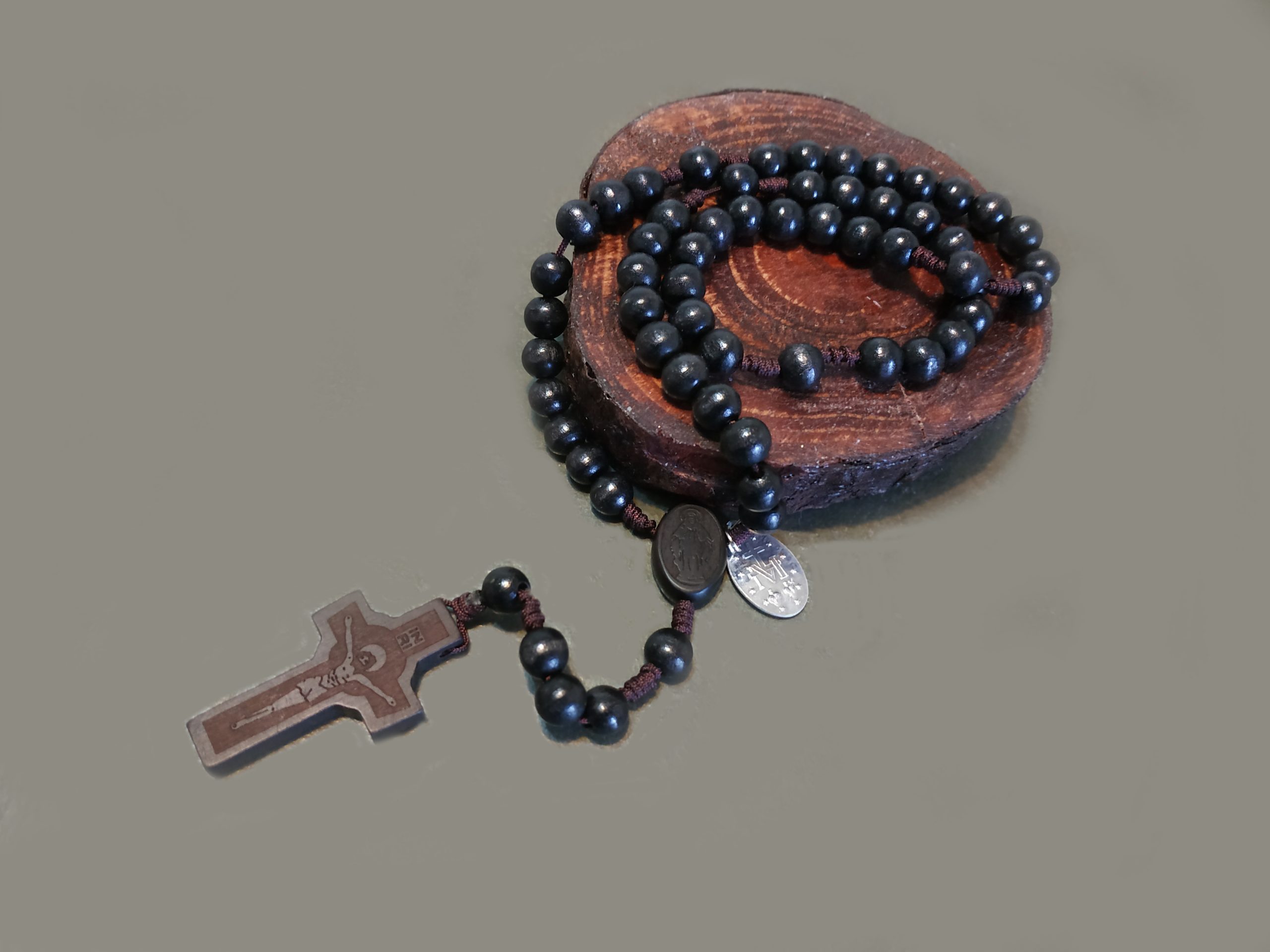Rosario con cuentas de madera, marieta y cruz tallada + medallita cantidad